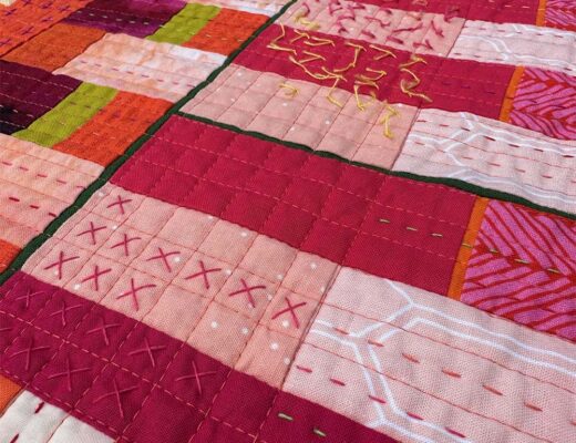 Binding:  Striped fabric in 2″ wide strips made using continuous bias techniques, machine stitched to the quilt front, hand stitched to the back