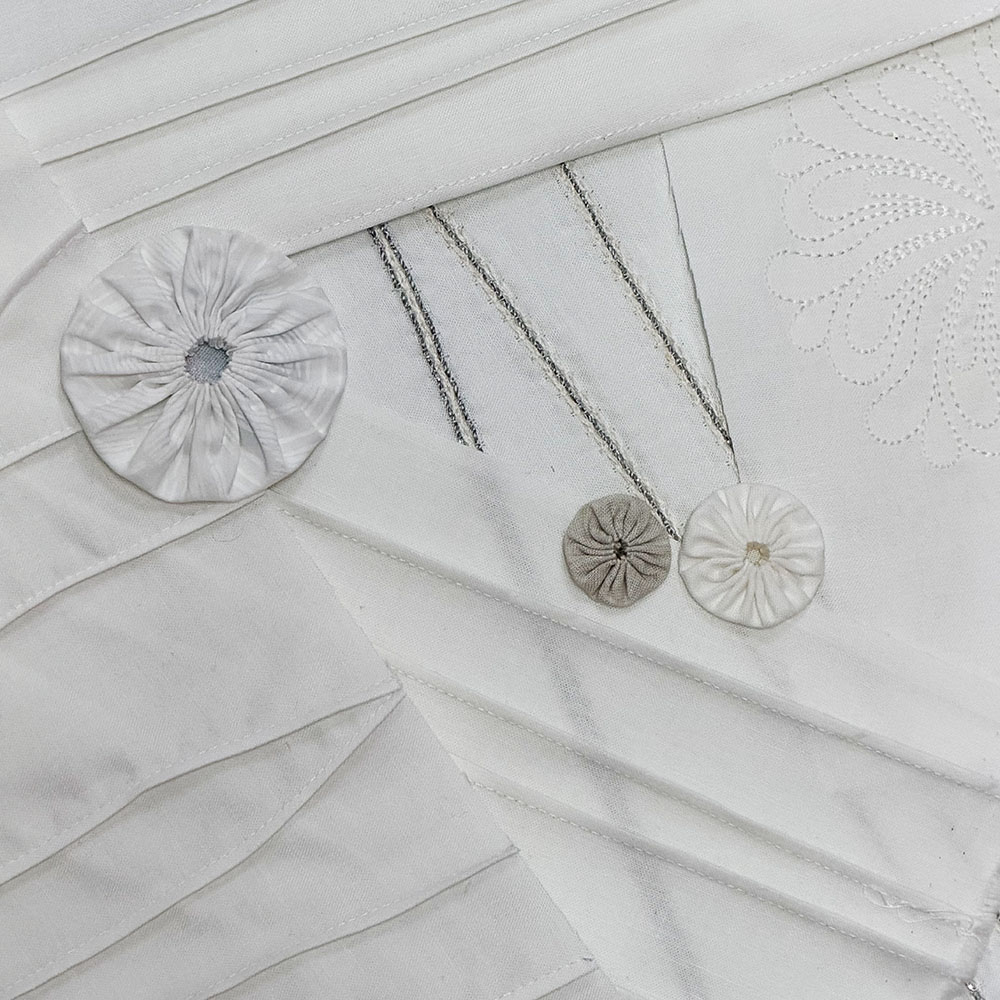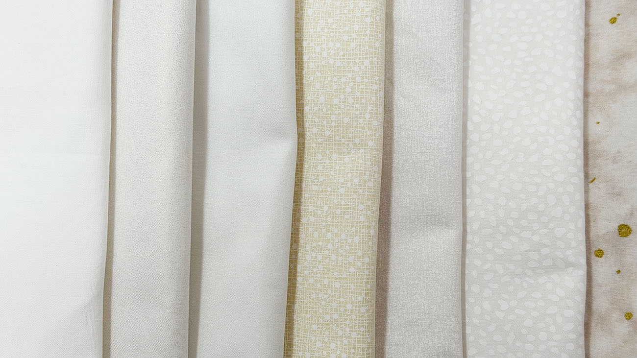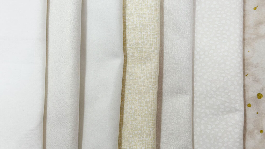 For my interpretation of Cloud Dancer, I’m using mostly white fabrics, with a bit of pale grey, beige, and soft pastels. I’m incorporating some solid whites, white-on-whites, and subtle prints. Within the solid white fabrics, I’m using quilting cotton, a bit of linen, and some Kona Sheen, which adds a metallic finish and provides another surface to catch and reflect light differently than standard quilting cottons.