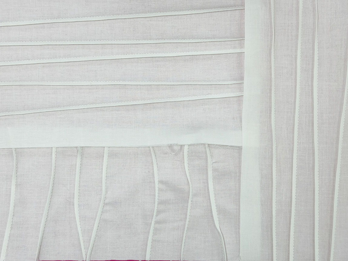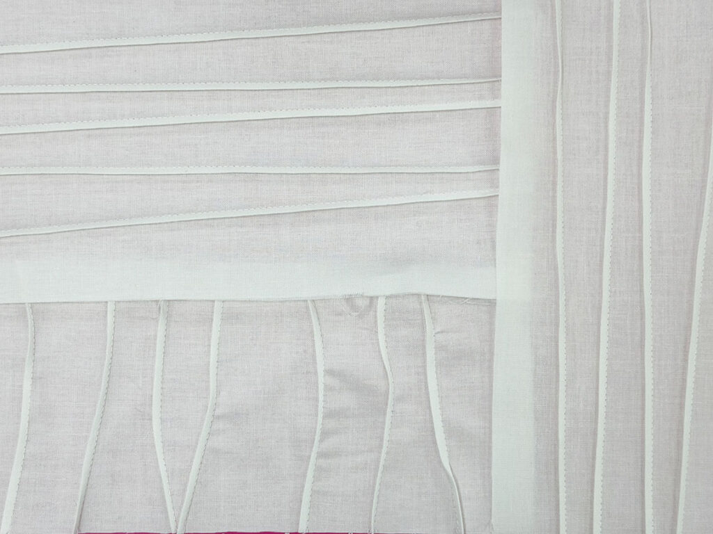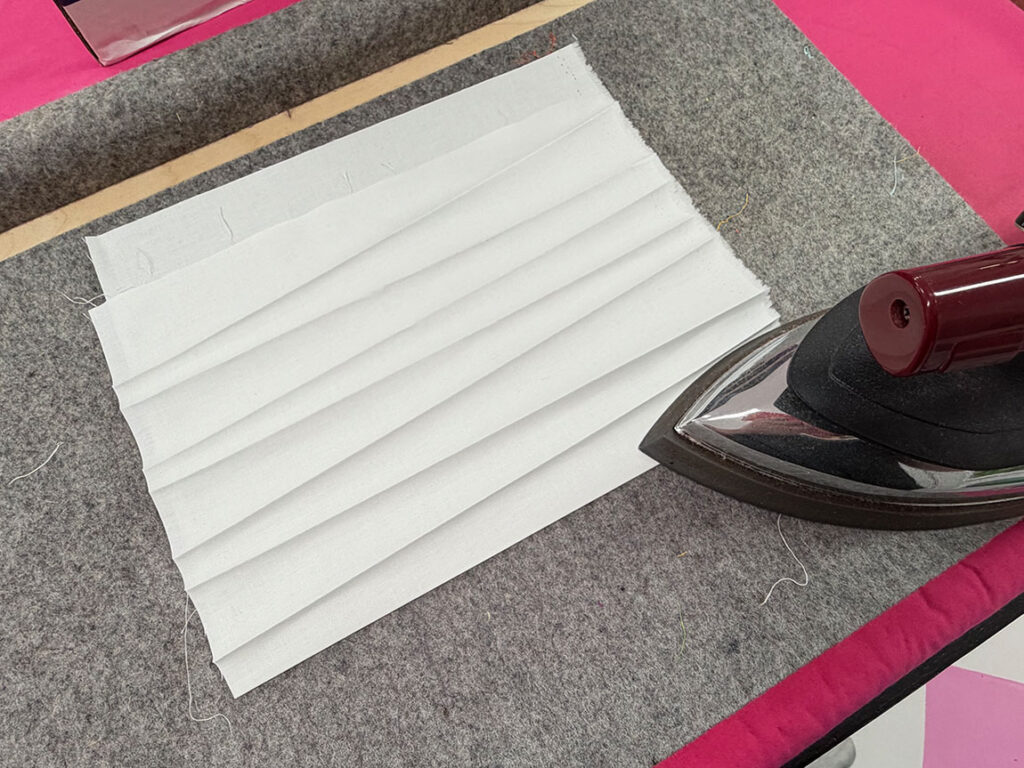 I’ve been creating straight line and organically shaped pleats to incorporate into my overall design. For the straight line tucks, I press the lines into the fabric before I sit down at the sewing machine, then stitch just under 1/8” from the fold line.